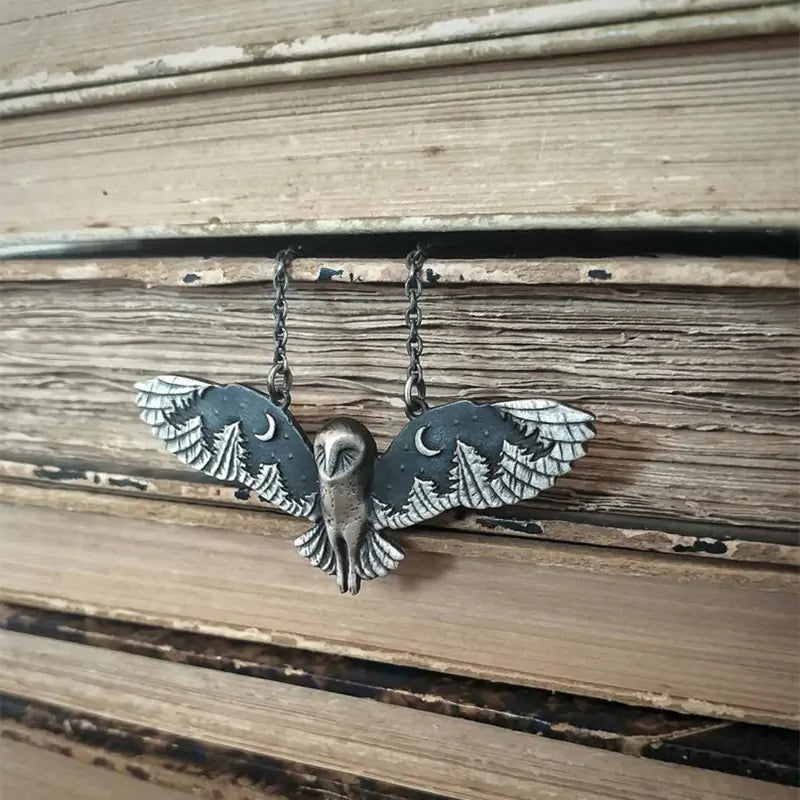 Make a statement with the Owl Witch Charm Pendant Necklace. Crafted from zinc alloy, this bold piece showcases a witch flying on an owl for added whimsy. The moon phase and animal totem designs lend a unique aesthetic to the look, making it ideal for dressing up an everyday outfit or accessorizing a special occasion gown. With its timeless yet modern design, this stylish jewelry item is sure to become your new favorite. Its versatile silver color ensures that it will pair effortlessly with any wardrobe. Whether you're looking for a special gift or simply treating yourself, this high-quality necklace is the perfect choice.